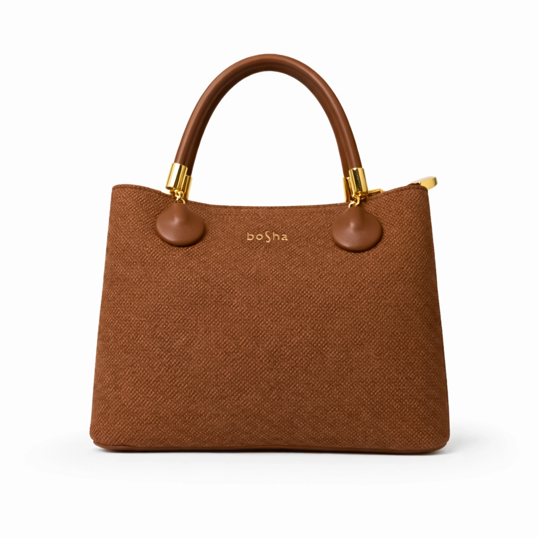 The handbag is crafted from premium textured PU leather, giving it a durable, scratch-resistant finish with a luxurious feel. Its structured shape ensures it stands upright and holds its form, while the double top handles offer a comfortable grip for hand carrying. The front is adorned with the minimalist “boSha” gold lettering, adding a subtle branded touch.