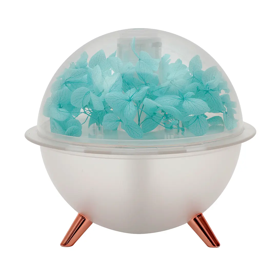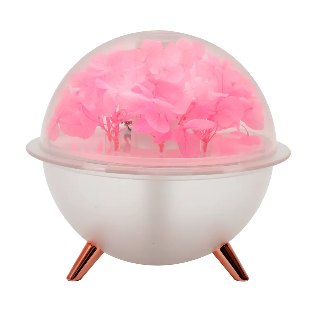 The lamp features a transparent crystal-clear dome that houses a beautiful arrangement of artificial hydrangea flowers. When switched on, the LED light glows softly through the petals, creating a dreamy and relaxing atmosphere perfect for unwinding after a long day. The sleek white base stands on three metallic-finish legs, giving it a modern, luxurious look that fits perfectly on bedside tables, office desks, or living room shelves.